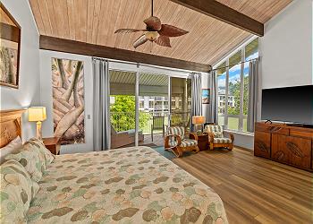 The master suite includes a king bed, en-suite bath, and rare air conditioning, while the rest of the condo is kept cool with ceiling fans and open-air flow. The loft, serving as the second bedroom, offers two queen-size mattresses—ideal for families or small groups. Enjoy the private lanai, surrounded by tropical greenery and cooled by tradewinds, as well as HDTV, free high-speed WiFi, in-unit washer/dryer, private access, and onsite parking for one vehicle.