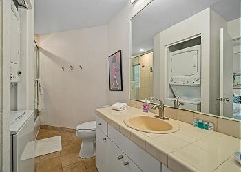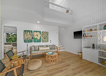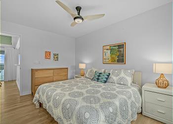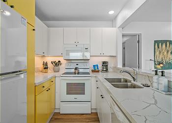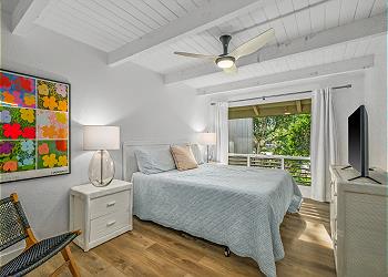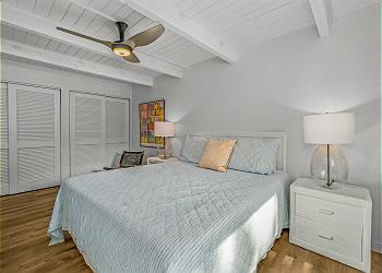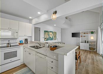 The condo features vinyl plank flooring, hard surface countertops, open-beam ceilings, and skylights that bring in natural light and the gentle trade winds. The fully equipped kitchen includes a stove, oven, refrigerator, dishwasher, and microwave, and the bedrooms are furnished with soft linens and tropical accents. Enjoy HDTV, high-speed WiFi, free onsite parking, and private access.